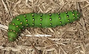 Caterpillars do not have very good eyesight. Rather than having fully-developed eyes they have a series of six tiny eyelets or 'stemmata' on each side of the lower portion of their head. They can probably form well focused, but poorly resolved images (Scoble, 1995). They move their heads from side to side probably as a means of aiding the resolution of objects, particularly plants. They rely on their short antennae to help them locate food. The larvae of sawflies differ from true caterpillars in this respect, as well, as they have prominent ocelli on the head capsule.