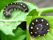 The larvae look like caterpillars (the larvae of moths and butterflies), with two notable exceptions; (1) they have five or more prolegs on the abdomen (caterpillars have five or fewer), and (2) they have two ocelli (eyes), instead of the caterpillar's six. Typical sawfly larvae are herbivorous, the group feeding on a wide range of plants. Individual species, however, are often quite specific in their choice of plants used for food. The larvae of various species exhibit leaf-mining, leaf-rolling, or gall formation. The larvae that do not feed externally on plants are grub-like, without prolegs.