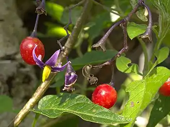 Solanum dulcamara (Bittersweet, Bitter Nightshade, Blue Bindweed, Climbing Nightshade, Fellenwort, Felonwood, Poisonberry, Poisonflower, Scarlet Berry, Snakeberry, Trailing Bittersweet, Trailing Nightshade, Violet Bloom or, Woody Nightshade) is a species of vine in the potato genus Solanum, family Solanaceae. It is native to Europe and Asia, and widely naturalised elsewhere, including North America, where it is an invasive problem weed. It occurs in a very wide range of habitats, from woodlands to scrubland, hedges and marshes.