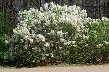 Lilacs range in size from large shrubs to small trees, 2-10 m tall. The leaves are opposite (occasionally in whorls of three), deciduous, and in most species simple and heart-shaped, but pinnate in a few species (e.g. S. laciniata, S. pinnatifolia). The flowers are produced in spring, each flower about 1 cm diameter, white, pale pink or more generally purple, with four petals. The flowers grow in large panicles, and in several species have a strong fragrance. Flowering starts after 80-110 growing degree days.
