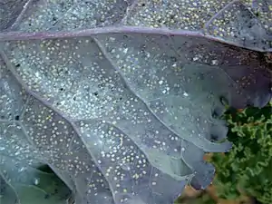 Females are capable of mating less than 24 hours after emergence and most frequently lay their eggs on the undersides of leaves. Eggs are pale yellow in colour, before turning grey prior to hatching. Newly hatched larvae, often known as crawlers, are the only mobile immature life-stage. During the first and second larval instars, the appearance is that of a pale yellow/translucent, flat scale which can be difficult to distinguish with the naked eye. During the fourth and final immature life-stage (the pupa), compound eyes and other body tissues become visible as the larvae thicken and rise from the leaf-surface.