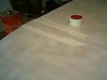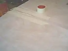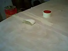 However, for our simple teardrop trailer we will create a moulding over the seam with Bondo. Step one is to apply masking tape on either side of the seam. Once that is done, mix some bondo according to the directions and apply a thick layer (about 1/8" thick) across the seam and over the edges of the masking tape.