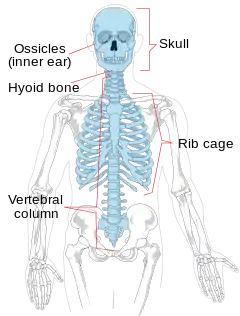 The Axial Skeleton is a division of the human skeleton and is named because it makes up the longitudinal axis of the body. It consists of the skull, hyoid bone, vertebral column, sternum and ribs. It is widely accepted to be made up of 80 bones, although this number varies from individual to individual.
