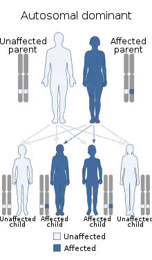 | Autosomal dominant | Only one mutated copy of the gene is needed for a person to be affected by an autosomal dominant disorder. Each affected person usually has one affected parent. There is a 50% chance that a child will inherit the mutated gene. Many disease conditions that are autosomal dominant have low penetrance, which means that although only one mutated copy is needed, a relatively small proportion of those who inherit that mutation go on to develop the disease, often later in life. | Huntingtons disease, Neurofibromatosis 1, HBOC syndrome, Hereditary nonpolyposis colorectal cancer |