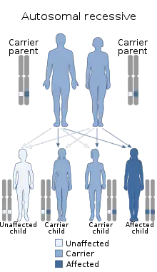 | Autosomal recessive | Two copies of the gene must be mutated for a person to be affected by an autosomal recessive disorder. An affected person usually has unaffected parents who each carry a single copy of the mutated gene (and are referred to as carriers). Two unaffected people who each carry one copy of the mutated gene have a 25% chance with each pregnancy of having a child affected by the disorder. | Cystic fibrosis, Sickle cell anemia, Tay-Sachs disease, Spinal muscular atrophy, Muscular dystrophy |
