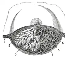 One distinguishes between a simple mammary gland, which consists of all the milk-secreting tissue leading to a single lactiferous duct, and a complex mammary gland, which consists of all the simple mammary glands serving one nipple.