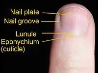 eponychium The cuticle of the fingernail is also called the eponychium. The cuticle is situated between the skin of the finger and the nail plate fusing these structures together and providing a waterproof barrier.