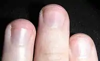 Mee's lines are associated with arsenic or thallium poisoning, and renal failure. White lines across the nail are associated with heart disease, liver disease, or a history of a recent high fever[12]. Opaque white nails with a dark band at the fingertip are associated with cancer, cirrhosis, congestive heart failure, diabetes and aging[13]. Paleness or whitening is associated with liver or kidney disease and anemia[14]. Yellowing of the nail bed is associated with chronic bronchitis, lymphatic problems, diabetes, and liver disorders. Brown or copper nail beds are associated with arsenic or copper poisoning, and local fungal infection. Grey nail beds are associated with arthritis, edema, malnutrition, post-operative effects, glaucoma and cardio-pulmonary disease[15]. redness is associated with heart conditions. dark nails are associated with B12 deficiency. Stains of the nail plate (not the nail bed) are associated with nail polish[16], smoking, and henna use.