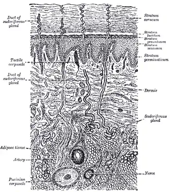 A diagrammatic sectional view of the skin (magnified). Sweat gland labeled as "sudoriferous gland" at center right.