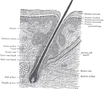 The dermis lies below the epidermis and contains a number of structures including blood vessels, nerves, hair follicles, smooth muscle, glands and lymphatic tissue. It consists of loose connective tissue otherwise called areolar connective tissue—collagen, elastin and reticular fibers are present. Erector muscles, attached between the hair papilla and epidermis, can contract, resulting in the hair fiber pulled upright and consequentially goose bumps. The main cell types are fibroblasts, adipocytes (fat storage) and macrophages. Sebaceous glands are exocrine glands which produce a mixture of lipids and waxy substances known as sebum. Sebum serves many functions, including lubrication, water-proofing, softening, and also provides antimicrobial properties. Sweat glands open up via a duct onto the skin by a pore.
