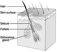 The sebaceous glands are glands found in the skin of mammals. They secrete an oily substance called sebum (Latin, meaning fat or tallow) that is made of fat (lipids) and the debris of dead fat-producing cells. These glands exist in humans throughout the skin except in the palms of the hands and soles of the feet. Sebum acts to protect and waterproof hair and skin, and keep them from becoming dry, brittle, and cracked. It can also inhibit the growth of microorganisms on skin.