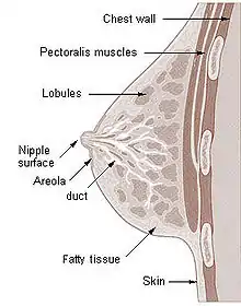 The basic components of the mammary gland are the alveoli (hollow cavities, a few millimetres large) lined with milk-secreting epithelial cells and surrounded by myoepithelial cells. These alveoli join up to form groups known as lobules, and each lobule has a lactiferous duct that drains into openings in the nipple. The myoepithelial cells can contract, similar to muscle cells, and thereby push the milk from the alveoli through the lactiferous ducts towards the nipple, where it collects in widenings (sinuses) of the ducts. A suckling baby essentially squeezes the milk out of these sinuses.