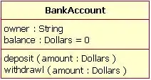 The above UML diagram is of the class "BankAccount", with two private variables "owner" of type String and "balance" of type Dollar, defaulting to value of 0. Two functions are part of the class, "Deposit" and "Withdraw", both which take a value of type Dollar as their parameter.