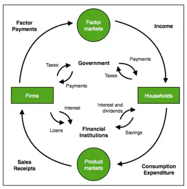 Household provides factor services and consumer spending to firms. Firms provide income and goods and services. Household income (Y) is spent on domestic firms’ output (O), country imports (M), taxes (T) to the government, and a portion is placed in the form of savings (S) in financial institutions, i.e. banks. T, S, and Ms are all termed leakages (L). These Ls are countered by injections (J) which is comprised of: government spending (G), investment expenditure (I), and export expenditure (X). Since L must always ultimately equal J it is a circular flow. Stock appreciation and discrepancies are taken into account too.