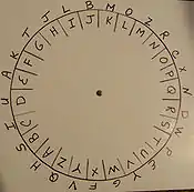 The Alberti Disk is a simple wheel device which provides 26 different substitution cipher alphabets. From the picture to the right, note that the 26 inner letters are in alphabetical order, but that the letters on the outside of the circle are in random order. For two people to send messages encrypted with an Alberti disk, they must have identical wheels (Gardner, 1972). [4]