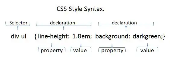 • Notice in the example that each rule consists of a CSS property and its value, separated from it with a full colon. The rules are separated from one-another by semi-colons, and if desired, an additional semi-colon can be added at the end. The whole expression is enclosed in curly brackets. Generally, spaces are permitted, but no space is permitted before a colon or semi-colon.