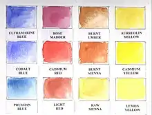 "Staining" is another characteristic of certain watercolor pigments. A staining color is difficult to remove and persists on the paper. Less staining colors can be lightened or removed almost entirely when wet or when re-wetted by "lifting" with a wet brush, paper towel, tissue, sponge, or similar.