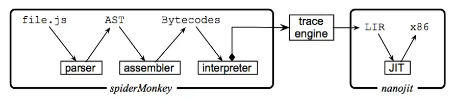 In general a JIT works in a way similar to the program above. It compiles the interpreted code, and dumps the result of this compilation, the binary code, into a memory array that is marked as executable. Then the JIT changes the execution flow of the interpreter to point to the newly written memory area. In order to give the reader a general picture of a JIT compiler, the figure below shows Trace Monkey, one of the compilers used by the Mozilla Firefox browser to run JavaScript programs.