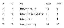 A comparison between foldr and foldl. Each number is the result of applying either foldl or foldr onto the seed 0 and the list [1, 2, 3, 4]. As we can see, the result is the same only when the binary operator is commutative (C) and associative (A).
