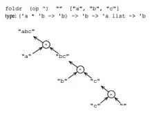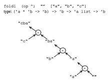 The sequence of applications that are produced by a call to foldl. Contrary to foldr, in this case the list elements are combined from left to right. In this particular example foldr would produce a different result, given that string concatenation is not a commutative operation.