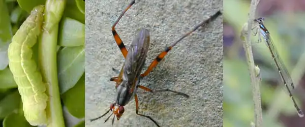![]() The insects are a diverse group. Shown: moth larva, Marsh fly, and damselfly. |
