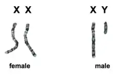 Individuals are initially biologically determined by their chromosomes. Males have a pair of XY sexual chromosomes whereas females possess XX chromosomes, resulting in hormonal differences that distinguish the two sexes. The Sex-determining Region Y gene, (on the Y chromosome), produces androgens (male sex hormones)[1] responsible for the anatomical differences. This gene is not present in the X chromosome, resulting in the individual being female.