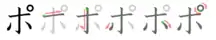 This page introduces "ハ", "ヒ", "フ", "ヘ" and "ホ". Adding two short lines, the dakuten (