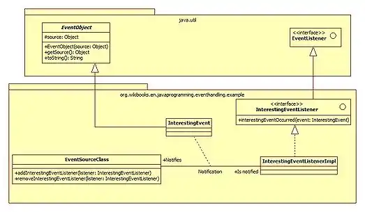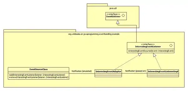 Whenever an interesting event occurs, the EventSourceClass must notify all of the listeners for that event that it knows about by calling the notification method that exist for that purpose. All of the notification methods (in this example there is only one, interestingEventOccurred) have been grouped together by topic in a listener interface: InterestingEventListener, which implements java.util.EventListener and is named according to the Event Model conventions. This interface must be implemented by all event listener classes (in this case only InterestingEventListenerImpl). Because EventSourceClass must be able to notify any interested listeners, it must be possible to register them. For this purpose the EventSourceClass has an addInterestingEventListener method. And since it is required, there is a removeInterestingEventListener method as well.