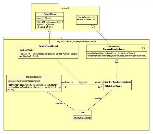 Next, we must define a listener interface. This interface must define methods for interesting events and must extend java.util.EventListener. We said earlier our interesting events were "number read" and "end of stream reached", so here we go: