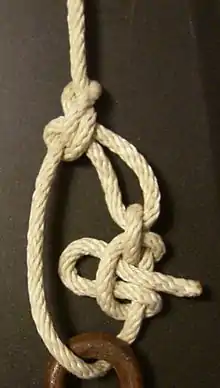 - Tie two half hitches, usually slipped for easy releasing, though a more secure finish may be called for. Whatever knot is used to secure the end to the loop, it should be kept in mind that when it is time to untie the knot, the knot will typically still be under load. Many knots are extremely difficult to untie under load. Even a half hitch may be challenging to untie even after the slipped second half hitch is pulled out.