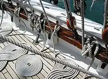 A piece of rope that has a specific purpose is called a line, especially in nautical usage. Examples include clothesline, chalk line, anchor line, stern line, fishing line, and so on.