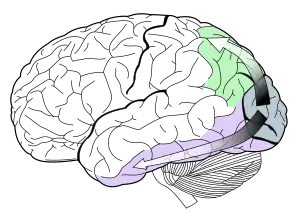 ![]() The primary visual cortex is shown here in blue. The two arrows show the two paths of information through the brain: to the temporal lobe (purple), and to the parietal lobe (green). |