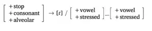 \phonb{\phonfeat{+stop \\ +consonant \\ +alveolar} }{[ɾ]}{\phonfeat{+vowel \\ +stressed} }{\phonfeat{+vowel \\ +stressed} }