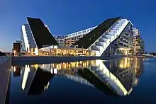 The Bjarke Ingels Group designed 8 House with the intention of connecting rural elements with a high density design. 8 House contains features to appeal to those who desire a single family home. The design included a 1700 square meter green roof which created the allusion of the open land of Kalvebod Faelled, a park west of 8 House, extending across the building. Due to the tiered structure of 8 House's roof, many residential units contained their own segment of green roof which simulates the front yard of a single family home.[18] 8 House's design optimized access to the neighboring Copenhagen Canal and Kalvebod Faelled.[18]