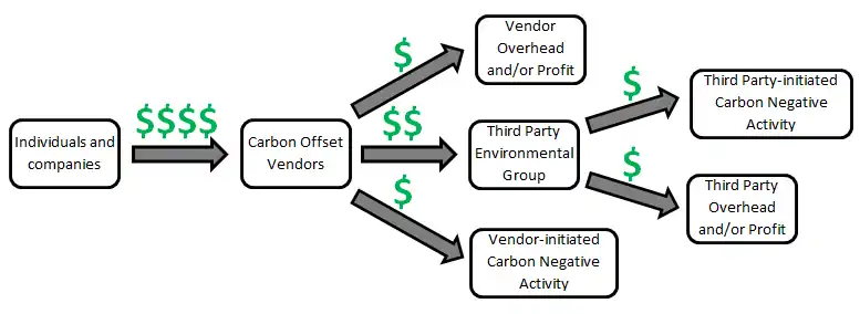 A carbon offset is a compensatory measure made by an individual or a company for carbon emissions, usually through sponsoring activities or projects which increase carbon dioxide absorption, such as tree planting.[1] When a carbon offset vendor sells a carbon offset, the revenue funds a carbon-negative initiative managed by the company itself or run by another organization. This relationship is illustrated below in Fig. 1.