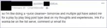 In popular media three identified levels of organization include the individual platform, the instagram-famous platform, and the celebrity blog platform. On the individual level, facebook friends can share their latest diet or workout. The displayed image is an example of someone announcing their day long juice cleanse, and asking friends to participate in her journey. Lee From America is a blogger who has 225,000 followers on Instagram and identifies as a “recipe developer, fitness lover, holistic lifestyle, naturally balancing hormones.” She uses her platform to share how her routine fits the aforementioned description. Gwenyth Paltrow’s website titled “Goop” is a “clean modern lifestyle brand” that offers “cutting edge advice from doctors”. The fan base consists of 1.8 million readers a month and they self identify as “goopies.”[13]