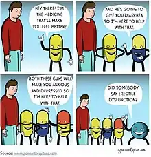 Drug companies seek out profit. Though they are regulated by the government, being a big industry with billions of dollars means there is a high incentive to keep pushing products. "The pharmaceutical industry plays too large of a role in influencing care practitioners and policy guidelines, and thus an overemphasis on medications" exist.[22] The United States is also one of the few countries where drug companies are allowed to market to consumers and patients directly. This directly affects the amount of medication prescribed because patients who ask for specific medications are much more likely to have something prescribed as those who simply wait for a doctor's diagnosis.[23] Drug companies also apply the largest pressure on doctors to prescribe, by giving incentives to clinics and hospitals. There seems to be no end in sight.