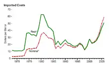 - ↑ Kesicki, Fabian (2010). "The third oil price surge – What's different this time?". Energy Policy 38 (3): 1596–606. doi:10.1016/j.enpol.2009.11.044.