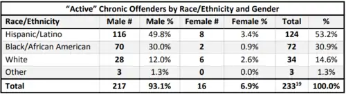 The LAPD also published an internal report on the use of predictive policing for the past 10 years. The study found that both the LASER program and PredPol software were ineffective at producing crime prevention and generating information at a rate any greater than the police officers already patrolling the city. The report notes that the racial makeup of both the hot districts and "Chronic Offenders" match the historical data of the 2000s and 2010s well, but this presumes absolute equity in reported crime and arrests for this period as well. [20]