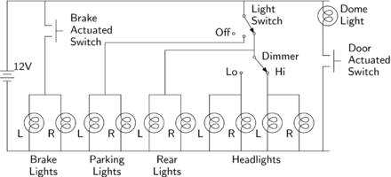 The diagram below shows some of a car's electrical network. The battery is on the left, drawn as stacked line segments. The wires are drawn as lines, shown straight and with sharp right angles for neatness. Each light is a circle enclosing a loop.