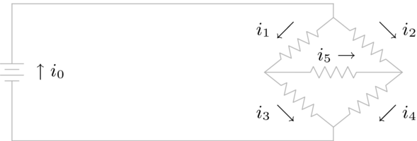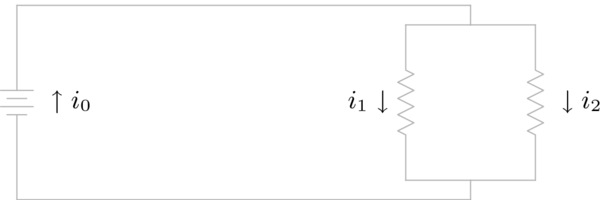 We begin by labeling the branches, shown below. Let the current through the left branch of the parallel portion be and that through the right branch be , and also let the current through the battery be . (We are following Kirchoff's Current Law; for instance, all points in the right branch have the same current, which we call . Note that we don't need to know the actual direction of flow— if current flows in the direction opposite to our arrow then we will simply get a negative number in the solution.)