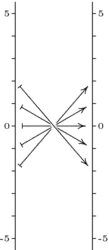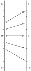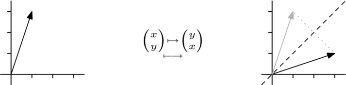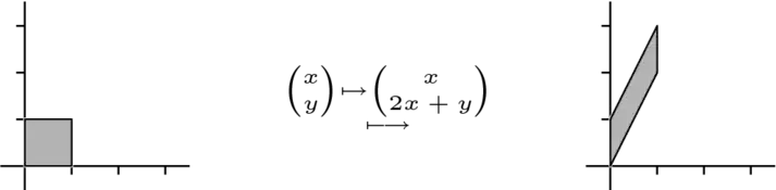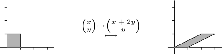 For contrast the next picture shows the effect of the map represented by . In this case, vectors are affected according to their second component. The vector is slid horozontally by twice .