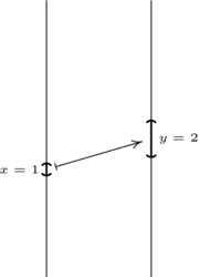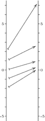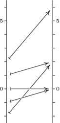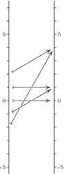 The pictures below contrast and , which are nonlinear, with and , which are linear. Each of the four pictures shows the domain on the left mapped to the codomain on the right. Arrows trace out where each map sends , , , , and . Note how the nonlinear maps distort the domain in transforming it into the range. For instance, is further from than it is from — the map is spreading the domain out unevenly so that an interval near is spread apart more than is an interval near when they are carried over to the range.