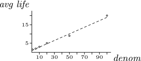 For example, the different denominations of U.S. money have different average times in circulation (the $2 bill is left off as a special case). How long should we expect a $25 bill to last?
