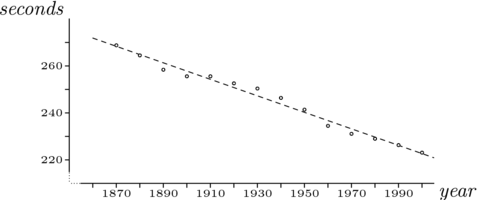 For the men's mile record, rather than give each of the many records and its exact date, we've "smoothed" the data somewhat by taking a periodic sample. Do the longer calculation and compare the conclusions.