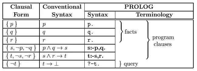 The language PROLOG uses resolution on a set of Horn clauses. Each clause is called a program clause. Moreover, clauses composed by a single literal are called facts. A clause with a single negated literal is called a query. The table below shows a comparison of the different notations. In PROLOG, to query a statement , the idea is to negate the statement () and to perform resolution with the set of known true statements. If a resolution refutation tree is found, the statement is implied by the program.