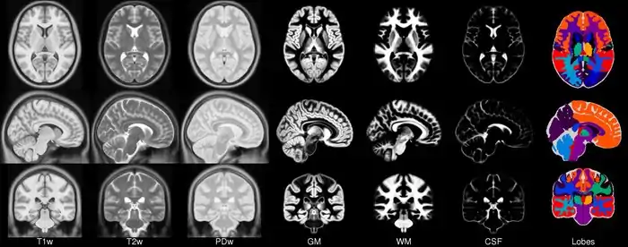 The entirely automatic analysis pipeline of this data also included grey/white matter segmentation via spatial priors (41). The averaged results of these segmentations formed the first MNI parametric maps of grey and white matter. The maps were never made publicly available in isolation but have formed parts of other packages for some time including SPM, FSL AIR and as models of grey matter for EEG source location in VARETTA and BRAINWAVE.