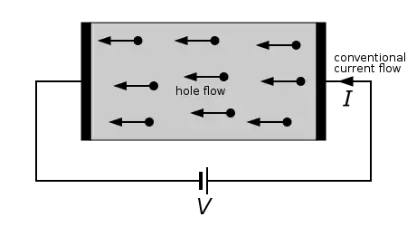 The hole is a carrier of positive charge. It is named "hole" because it equivalent to an empty space in the lattice of the conductor where an electron could be. It has the same charge as the electron, but positive. Therefore, the holes move in the same direction as conventional current: