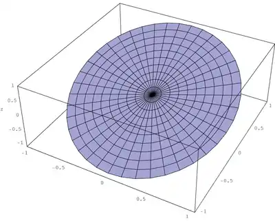 There is no built in function to make a polar 3D surface plot (that is, height governed by radius and angle). However,a small amount of code allows us to draw one using the identities between Cartesian and polar coordinate systems: