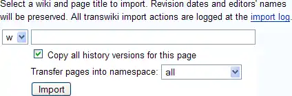This is the interface used on Wikimedia projects (other than those that still have it disabled entirely). For this interface, choose the one-letter code that represents the project to import from (w = Wikipedia, b = Wikibooks, etc.); the ones listed will depend on what projects have been added as import sources. Projects that do not have their codes on this list cannot be imported from. Next, enter the page name. Only one page can be imported at a time using this interface. Talk pages are not automatically included and must be imported separately. Unchecking "Copy all history versions for this page" will result in only the current revision being carried across (similar to Special:Export's "Include only the current revision, not the full history" feature). "Transfer pages into namespace:" allows you to choose a namespace; for a page that needs cleanup, using the Transwiki namespace, if there is one, is probably a good idea.